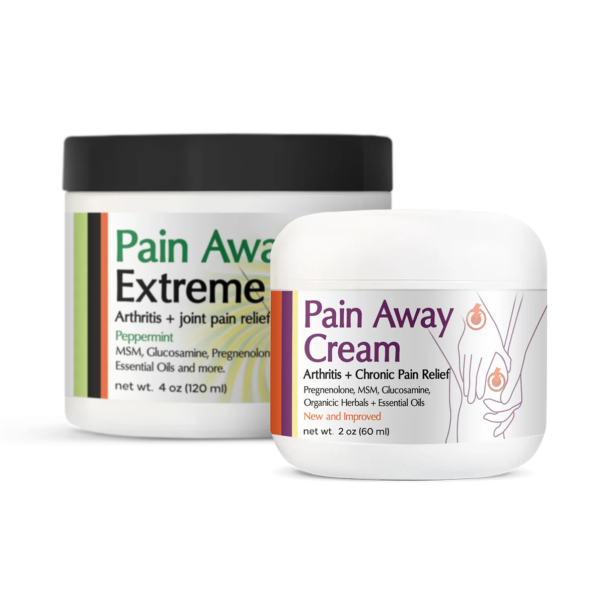 Pain Away Cream is the best arthritis pain relief cream using the therapeutic benefits of pregnenolone, essential oils like copaiba, wintergreen and spearmint, MSM (Methylsulfonylmethane), periwinkle and other organic herbal ingredients and so much more to alleviate chronic pain. Now in both New and Improved Pain Away Cream and our Original Pain Away Extreme (cold processed). (Original Unscented Pain Away Cream available only while supplies last.)